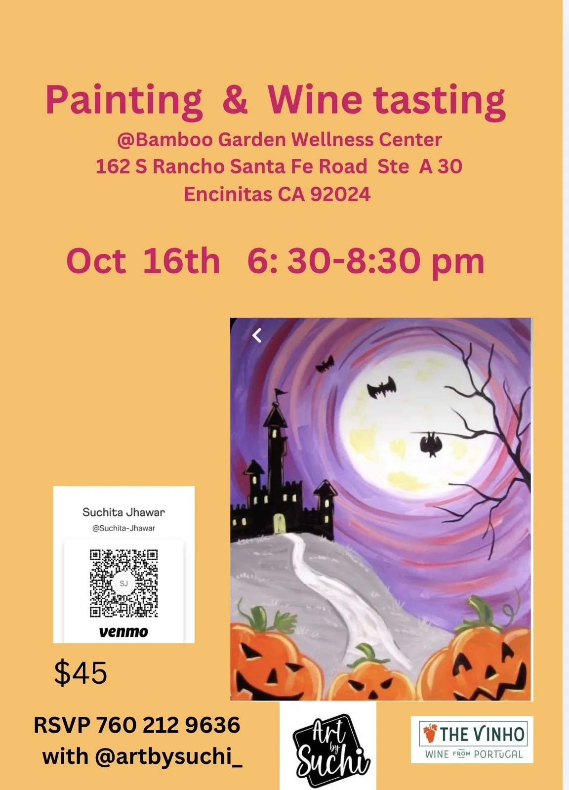 Join us for a fun and relaxing evening of painting and sipping! We will be creating a fun Halloween design while enjoying a glass of wine. Express your inner creativity this season and create a lasting Halloween decoration. Our experienced instructor, Suchi, will guide you step by step, so no prior painting experience is necessary. All materials will be provided, including a canvas, paint, and brushes. Come alone or bring some friends for a night of art and fun!