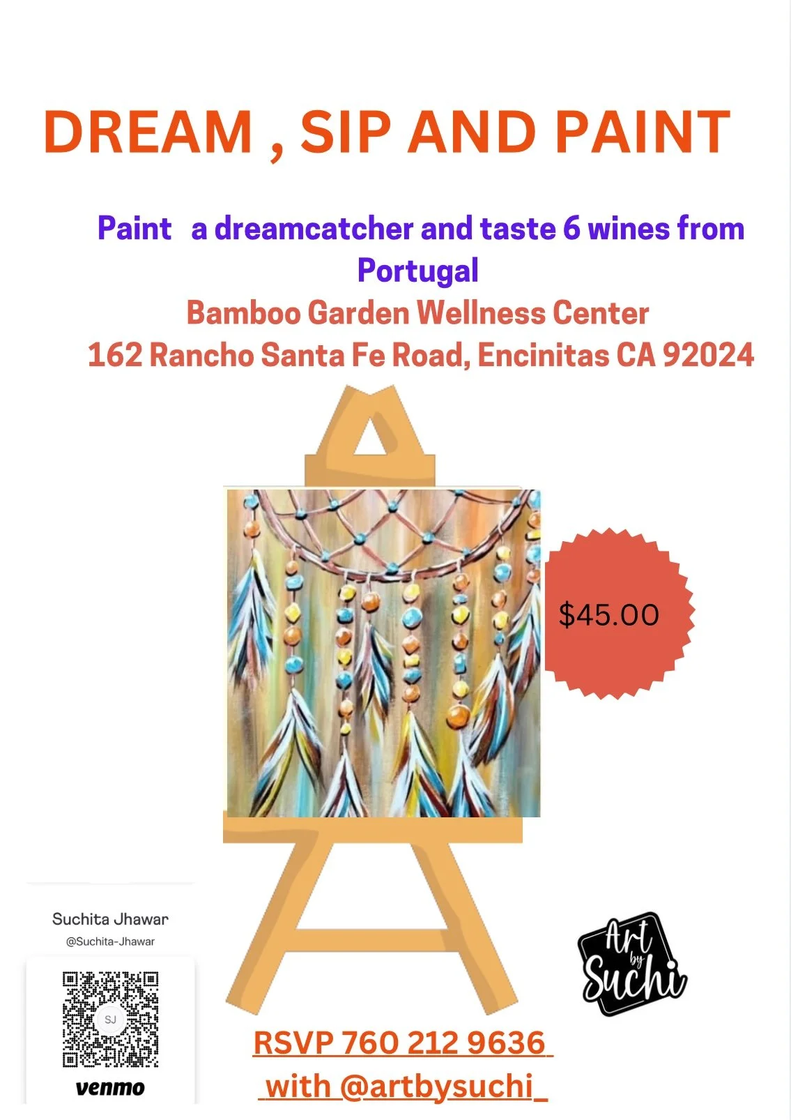 Join us for a fun and relaxing evening of painting and sipping! We will be creating a Dream Catcher painting while enjoying a glass of wine or tea. Express your inner creativity in the new year and create a lasting piece of art. Our experienced instructor, Suchi, will guide you step by step, so no prior painting experience is necessary. All materials will be provided, including a canvas, paint, and brushes. Come alone or bring some friends for a night of art and fun!